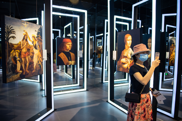 A visitor takes a picture while viewing Tribute to Da Vinci, an art exhibition at the Changsha International Finance Square in Changsha, Central China's Hunan province, on May 4, 2020. [Photo/Xinhua]