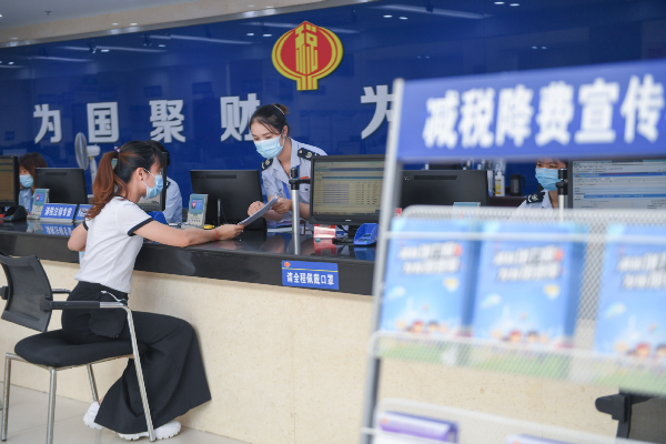 An employee of a company applies for taxation refunds with the guidance of a professional staff member at a taxation bureau in Fuzhou, East China's Fujian province, on Sept 22, 2020. [Photo/Xinhua]