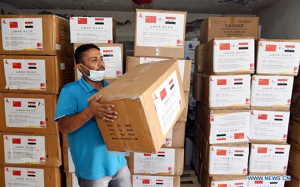A worker arranges medical donations from China at a hospital in Damascus, capital of Syria, Sept 24, 2020. A new batch of medical donations from China was delivered to the Syrian health authorities on Thursday to help the country fight COVID-19 pandemic. The aid, raised and donated by a voluntary organization in the eastern Chinese province of Zhejiang, includes face masks, goggles, protection suits and ventilators, according to the Chinese Embassy in Syria. [Photo by Ammar Safarjalani/Xinhua]