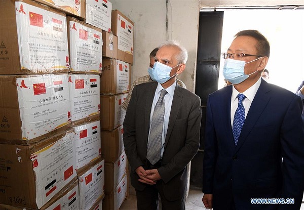Ahmad Khleifawi (L), deputy Syrian health minister, and Chinese Ambassador to Syria Feng Biao (R) look at medical donations from China in Damascus, capital of Syria, Sept 24, 2020. A new batch of medical donations from China was delivered to the Syrian health authorities on Thursday to help the country fight COVID-19 pandemic. The aid, raised and donated by a voluntary organization in the eastern Chinese province of Zhejiang, includes face masks, goggles, protection suits and ventilators, according to the Chinese Embassy in Syria. [Photo by Ammar Safarjalani/Xinhua]