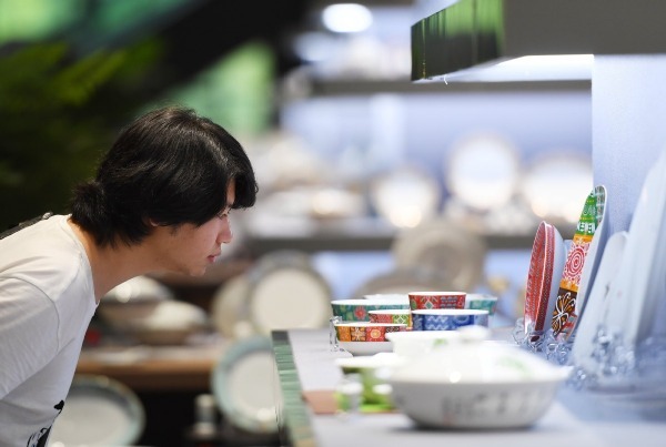A visitor takes in ceramic products at an exhibition hall in Jingdezhen, Jiangxi province, in August. [Photo by Wei Xiaohao/China Daily]
