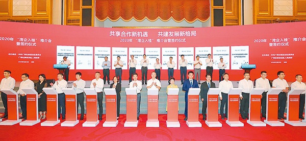 A total of 92 projects invested in by companies in the Guangdong-Hong Kong-Macao Greater Bay Area were signed both online and offline to settle down in Guangxi Zhuang autonomous region during a promotion fair held on Sept 24 in Shenzhen, Guangdong province.