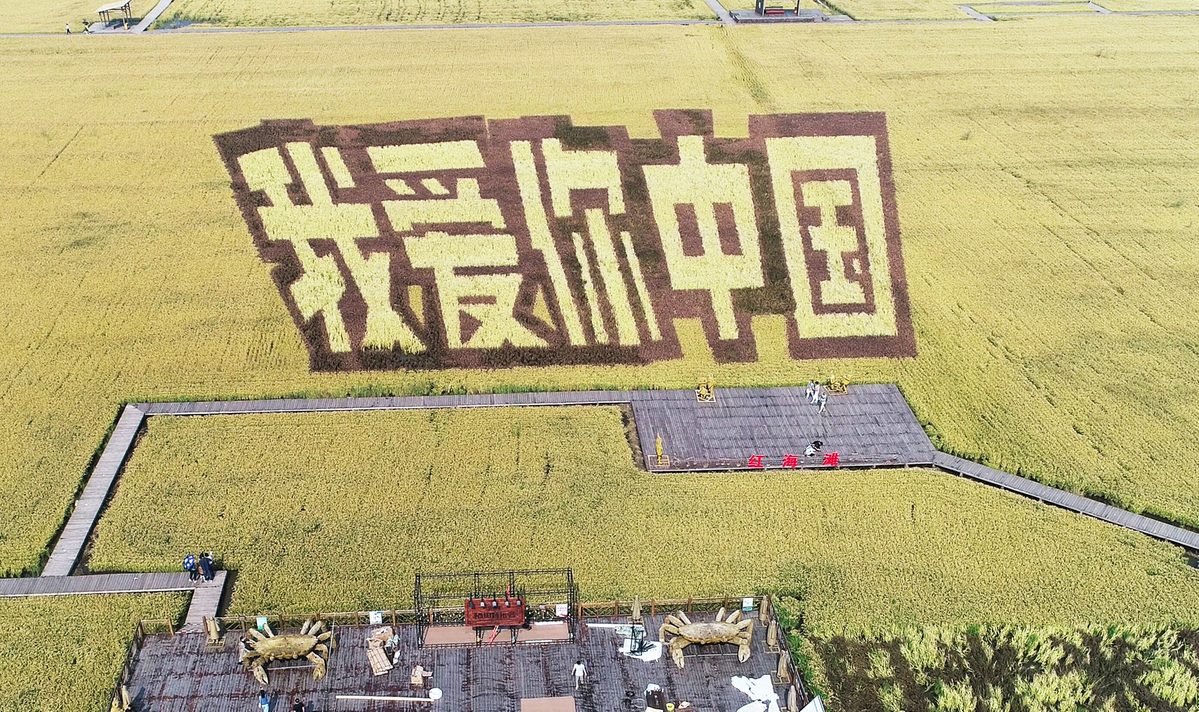 An aerial photo taken on Sept 23, 2020 shows five Chinese characters on the golden rice paddy fields that mean "I love you, China" on the coastal wetland of Panjin, Northeast China's Liaoning province. [Photo by Xing Ming/Provided to chinadaily.com.cn]