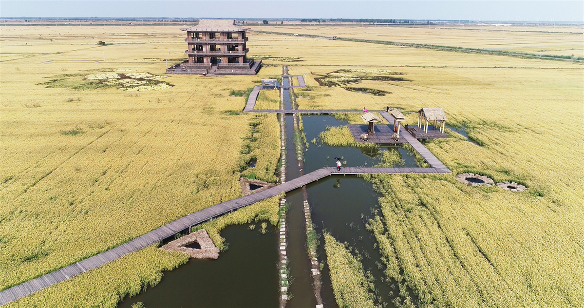 Rice paddies turn golden on the coast of Panjin, Northeast China's Liaoning province, on Sept 23, 2020. [Photo by Xing Ming/Provided to chinadaily.com.cn]
