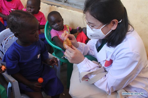 A member of Chinese medical team shares a mooncake with a child at the Juba Orphanage Home in Juba, South Sudan, Oct 6, 2020. The 8th batch of the Chinese medical team in South Sudan on Oct 6 visited a children's home to provide medical care. [Photo by Gale Julius/Xinhua]