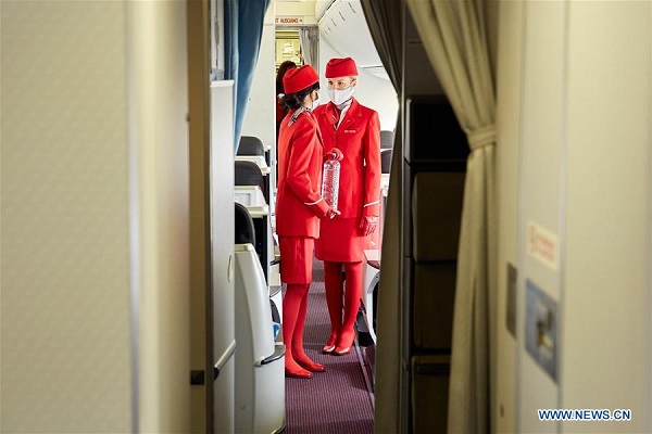 Stewardesses of Austrian Airlines work on a flight to Shanghai before takeoff at the Vienna International Airport in Schwechat, Austria, on Oct 2, 2020. Austrian Airlines resumed passenger flights to Shanghai on Oct 2, which were suspended due to the COVID-19 pandemic. [Photo by Georges Schneider/Xinhua]