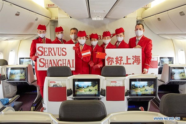 Crew of Austrian Airlines' first resumed passenger flight to Shanghai pose for a group photo in a plane at the Vienna International Airport in Schwechat, Austria, on Oct 2, 2020. Austrian Airlines resumed passenger flights to Shanghai on Oct 2, which were suspended due to the COVID-19 pandemic. [Photo by Georges Schneider/Xinhua]