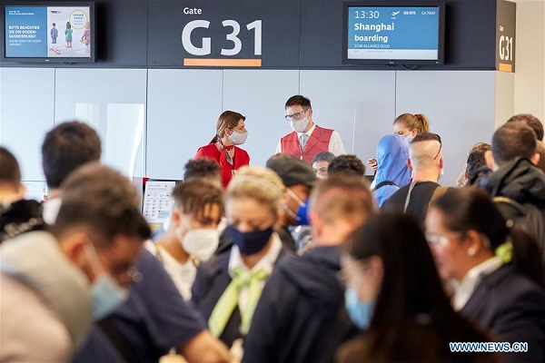 Passengers line up to board a flight to Shanghai at the Vienna International Airport in Schwechat, Austria, on Oct 2, 2020. Austrian Airlines resumed passenger flights to Shanghai on Oct 2, which were suspended due to the COVID-19 pandemic. [Photo by Georges Schneider/Xinhua]