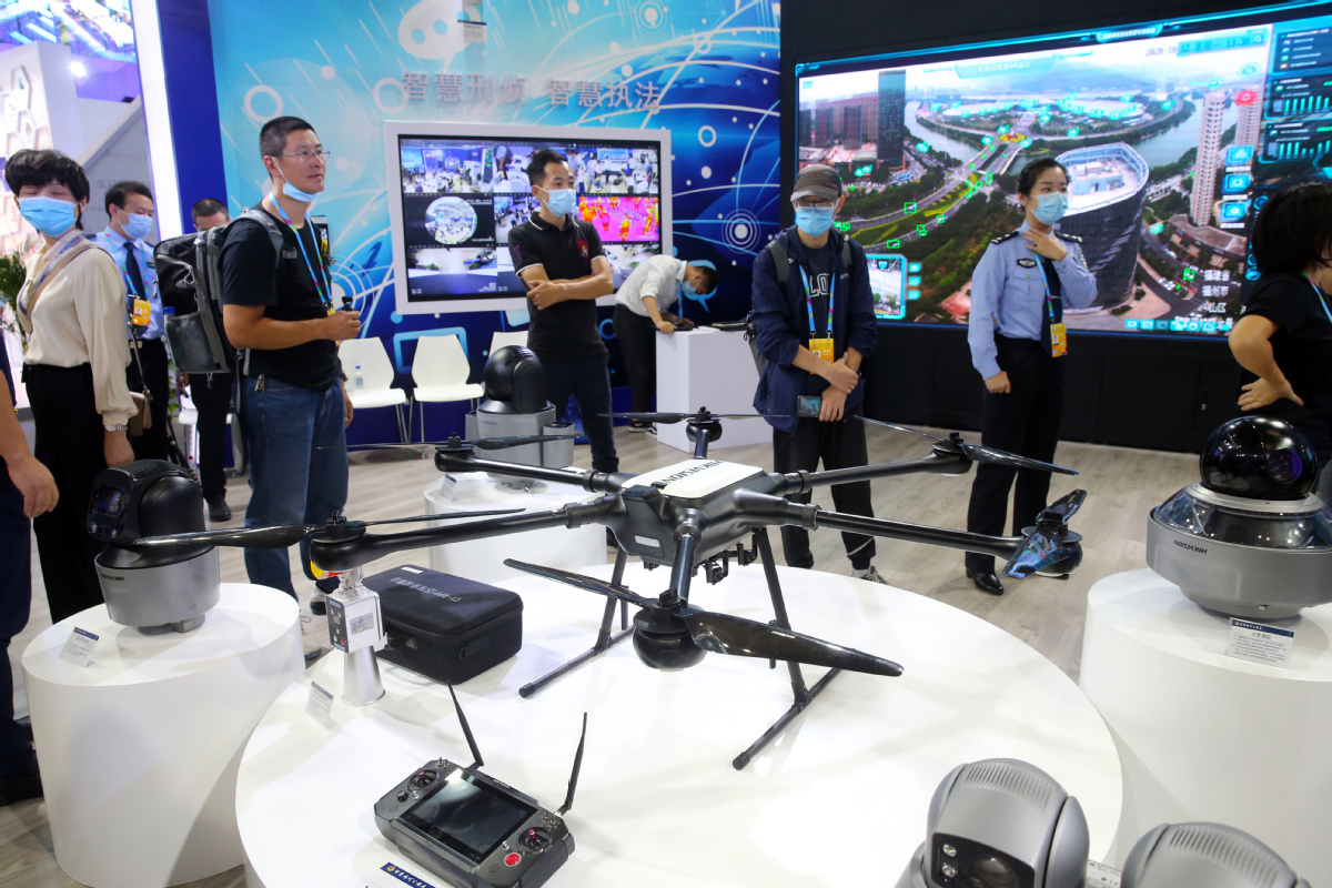 Visitors take a look at a drone displayed during an achievement expo on Digital China in Fuzhou, East China's Fujian province, on Oct 12, 2020. [Photo by Hu Meidong/chinadaily.com.cn]
