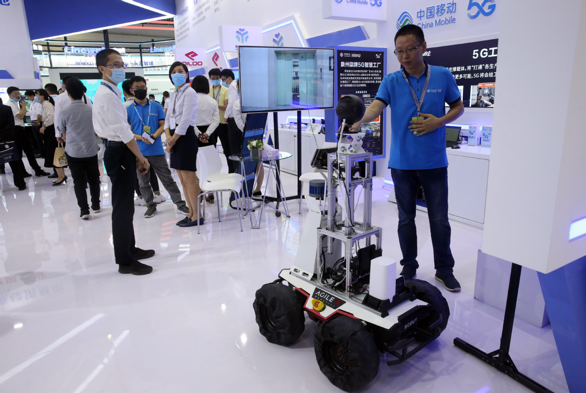 A latest 5G robot is displayed during an achievement expo on Digital China. [Photo by Hu Meidong/chinadaily.com.cn]