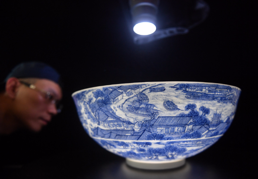 A visitor views the egg shell porcelain bowl decorated with the famous Chinese painting "Along the River During the Qingming Festival" made by the team "Kuaixueshiqing" in Jingdezhen, East China's Jiangxi province, Oct 15, 2019. Egg shell porcelain, a renowned kind of traditional porcelain work produced in Jingdezhen of Jiangxi, is famous for its thin and transparent body which makes it special.[Photo/Xinhua]
