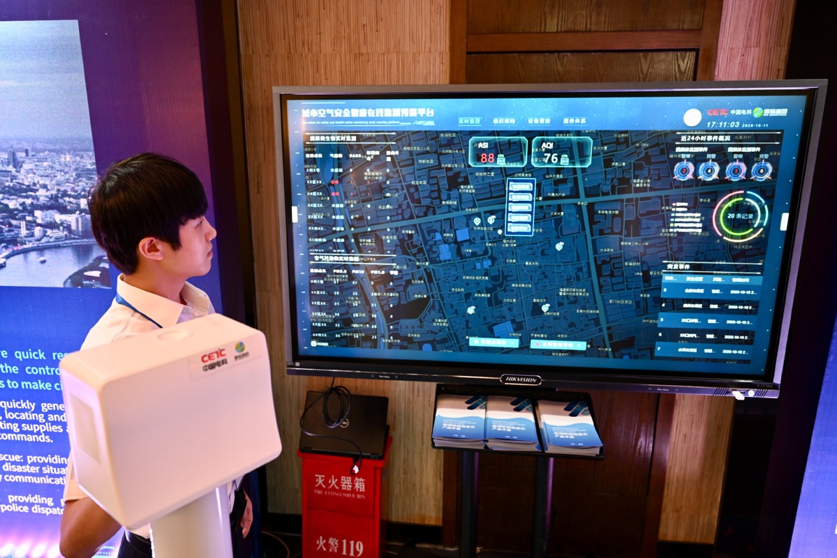 A staff member demonstrates an urban air monitoring and warning system at a sideline event of the 3rd Digital China Summit on Oct 11, 2020. [Photo/Xinhua]