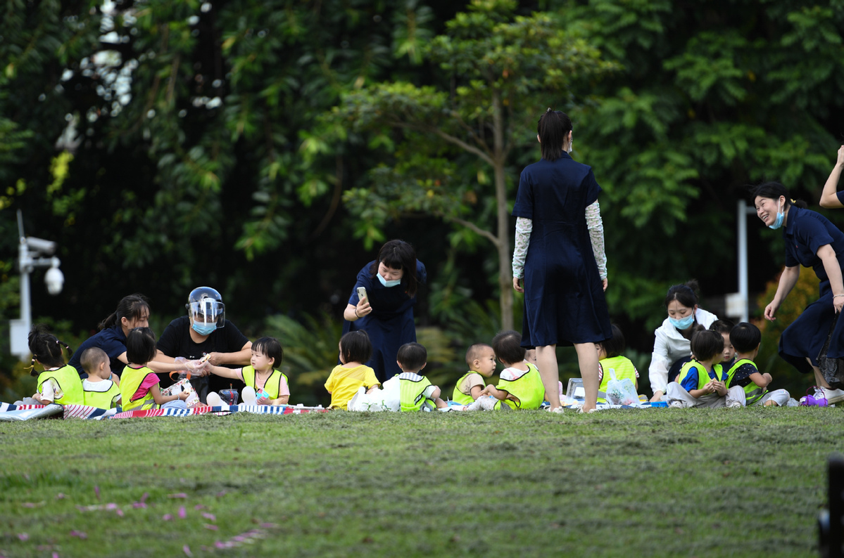 Teachers and children play at a park in the Futian district of Shenzhen on Sept 22, 2020. [Photo/Xinhua]