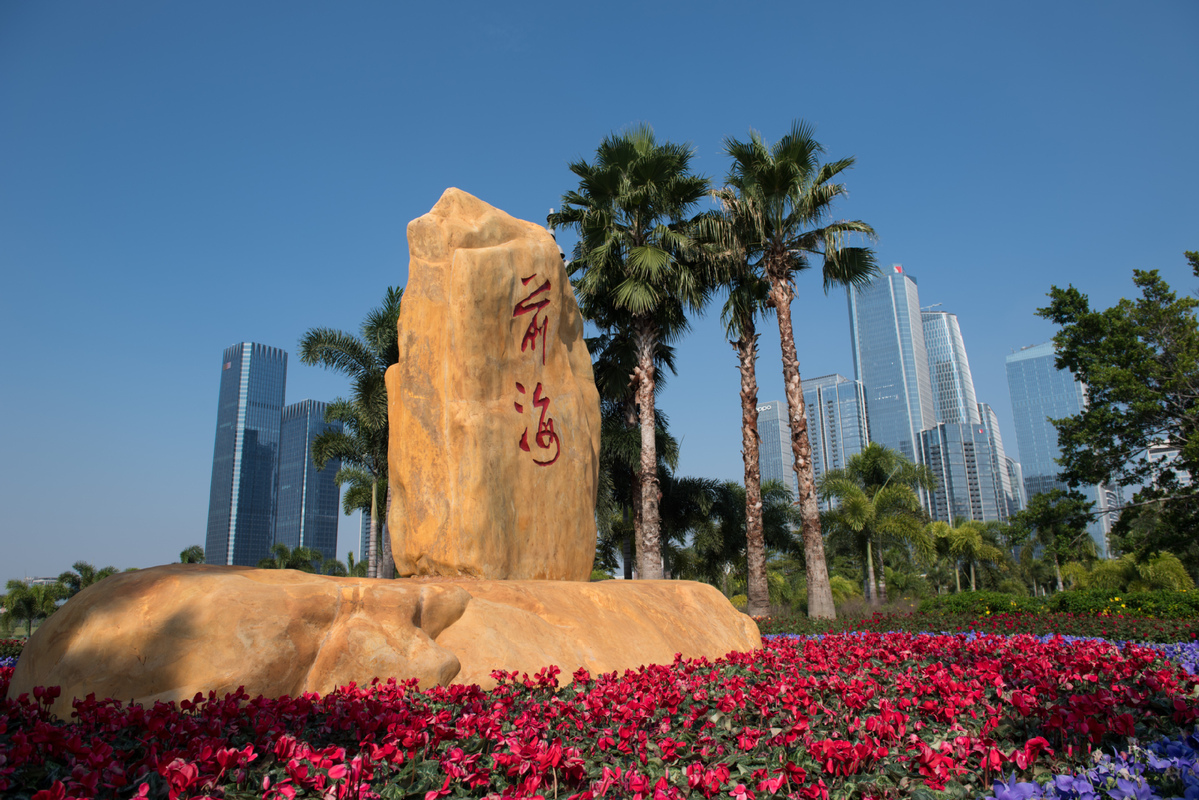 A stone with characters "Qianhai" is seen in the Qianhai district of Shenzhen on Oct 12, 2020. [Photo/Xinhua]