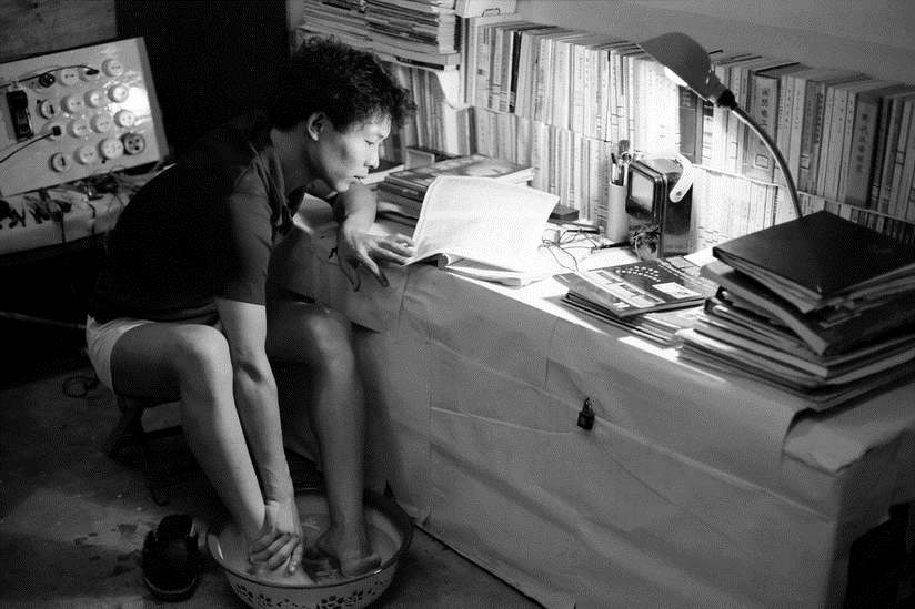 An electrician and broadcaster with the construction troop based in Shenzhen washes his feet while reading a book. [Photo by Zhou Shunbin/cpanet.org.cn]