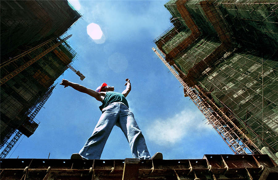 A worker stretches his arms to the sky on the Hongling Mansion construction site in Shenzhen in 1984. [Photo by Zhou Shunbin/cpanet.org.cn]