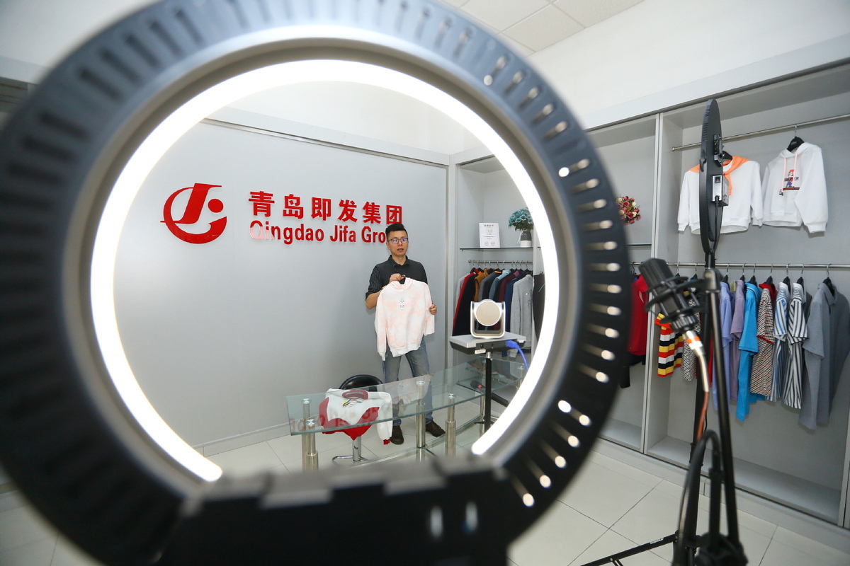 A staff member of Qingdao Jifa Group showcases apparel products via the livestreaming platform of online Canton Fair in Qingdao, East China's Shandong province, Oct 15, 2020. [Photo/Xinhua]