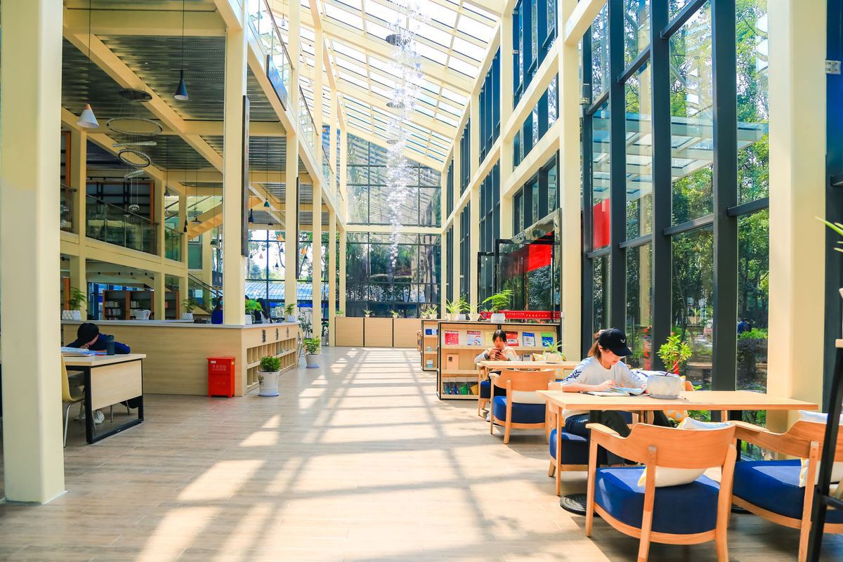 Floor-to-ceiling windows create a bright, airy atmosphere for students reading on the fourth floor of the Xingchen Library at Wuhan University of Bioengineering in Wuhan, Central China's Hubei province. [Photo provided to chinadaily.com.cn]