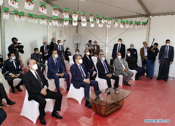 Algerian Prime Minister Abdelaziz Djerad attends the inauguration and handover ceremony of the Public Engineering Technology School which was assisted by China State Construction Engineering Corporation (CSCEC) Algeria in Berbih, province of Djelfa, 300 km south of Algiers, Algeria, Oct 17, 2020. Algerian Prime Minister Abdelaziz Djerad has praised the Chinese firms in Algeria for making new contribution to Chinese-Algerian friendship. Djerad made the remarks on Saturday while attending the inauguration and handover ceremony. [Photo/Xinhua]