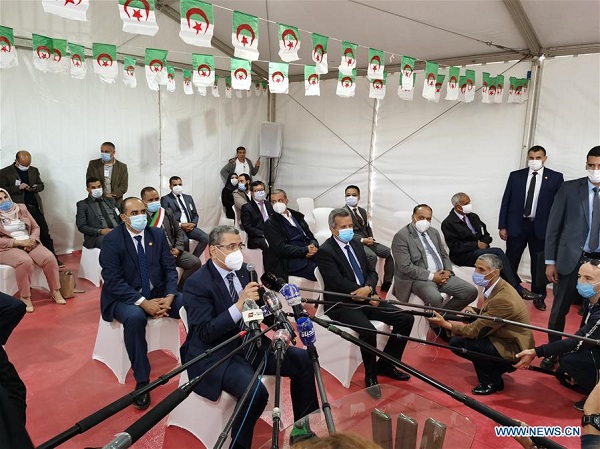 Algerian Prime Minister Abdelaziz Djerad speaks during an interview in Berbih, province of Djelfa, 300 km south of Algiers, Algeria, Oct 17, 2020. Algerian Prime Minister Abdelaziz Djerad has praised the Chinese firms in Algeria for making new contribution to Chinese-Algerian friendship. Djerad made the remarks on Saturday while attending the inauguration and handover ceremony of the Public Engineering Technology School which was assisted by China State Construction Engineering Corporation (CSCEC) Algeria. [Photo/Xinhua]
