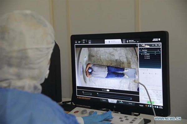 CT technician Hanan Jamal completes a scan for a patient at al-Shifaa Center in Baghdad, Iraq, Oct 12, 2020. In a specialized COVID-19 hospital in Iraqi capital of Baghdad, a Chinese-donated CT scan, mobile X-ray equipment, and other medical supplies are saving lives in the front-line battle against the COVID-19 pandemic. Already 400 patients have benefited from the important medical donation. [Photo/Xinhua]