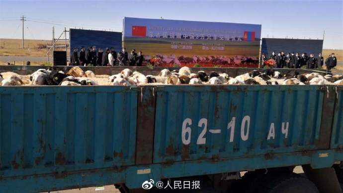 A truck carrying the first batch of 4,000 live sheep from Mongolia to Wuhan, Central China's Hubei province, arrives at Erenhot Port in North China's Inner Mongolia autonomous region, on Oct 22, 2020. [Photo/official Sina Weibo account of People's Daily]