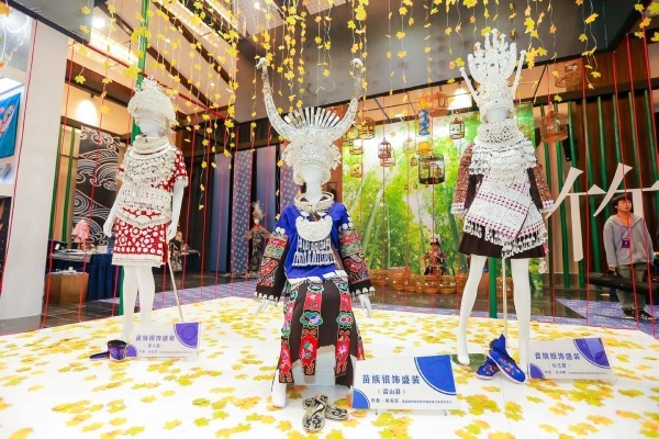 In an exhibition, Guizhou's intangible cultural heritage inheritors showcase their artworks and skills, such as the Miao ethnic group's traditional silver ornaments and embroidery. Tourists also can learn simple skills from them, for example, making a handkerchief via the traditional batik craft of dyeing.