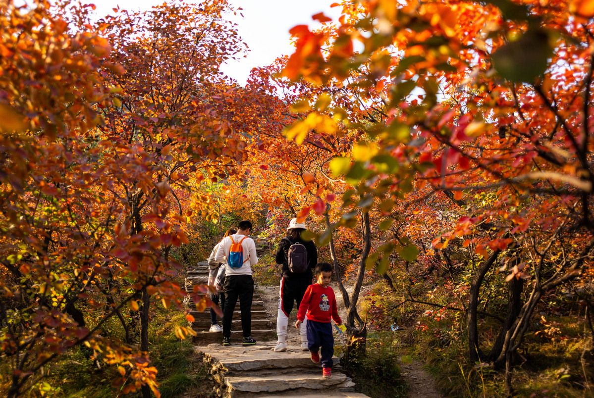 Tourists enjoy the cascade of red leaves at Pofengling Scenic Area in Fangshan district of Beijing, Oct 18, 2020. [Photo/Xinhua]