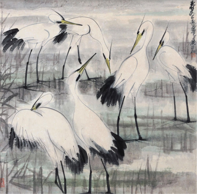 Another key piece showcasing the new tradition is Egrets, an ink-and-color-on-paper painting by Lin Fengmian, who studied arts in the 1920s. The emotive qualities of Lin's work are often attributed to the influence of European masters such as Henri Matisse, Pablo Picasso and Georges Rouault. But Lin painted this piece in a square format popular in the Song Dynasty (960-1279).