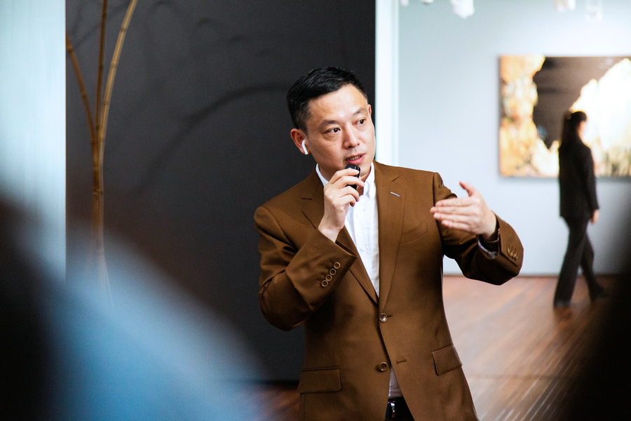 The Revival of Tradition: Another Approach to Contemporary Chinese Art, gives a tour to guests at the opening ceremony at the Song Art Museum in Beijing on Sept 25, 2020. [Photo provided to chinadaily.com.cn]