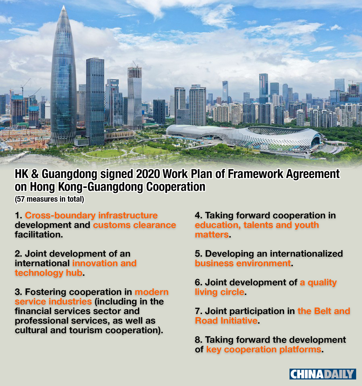 Hong Kong SAR government on Friday signed the 2020 Work Plan of the Framework Agreement on Hong Kong-Guangdong Cooperation, covering 57 measures in eight major areas to facilitate all-around exchanges. See the infographic above for more details.