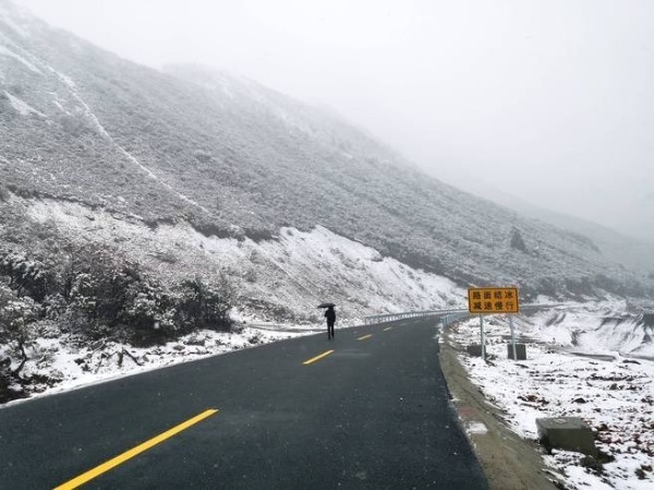 The first snow in Yunnan province's Dechen Tibet autonomous prefecture covers the highway linking Shangri-La with Yading of Daocheng county, Sichuan province. The road, which is under construction, averages more than 3,200 meters above sea level. Expected to open by the end of this year, it will shorten the drive from more than seven hours to about four and a half hours. [Photo provided to chinadaily.com.cn]