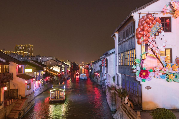 The quaint buildings along the waterway and charming bridges over the ancient canal in Wuxi feature beautiful illuminations in the evening. [Photo/VCG]