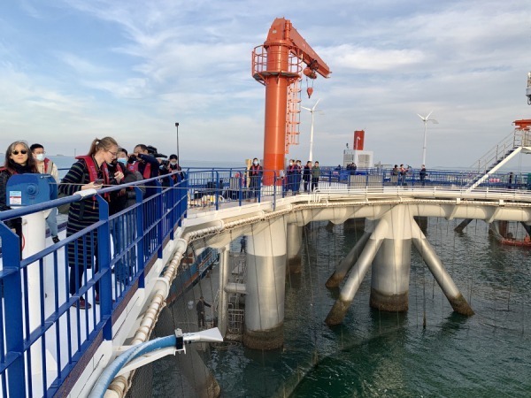 A group of expats visit the "Genghai No 1" marine ranch complex in Yantai, Shandong province on Oct 28. "Genghai No 1" serves as multifunctional intelligent ecological marine ranch platform for fishing, recreation, scientific and technological research and development. [Photo/chinadaily.com.cn]