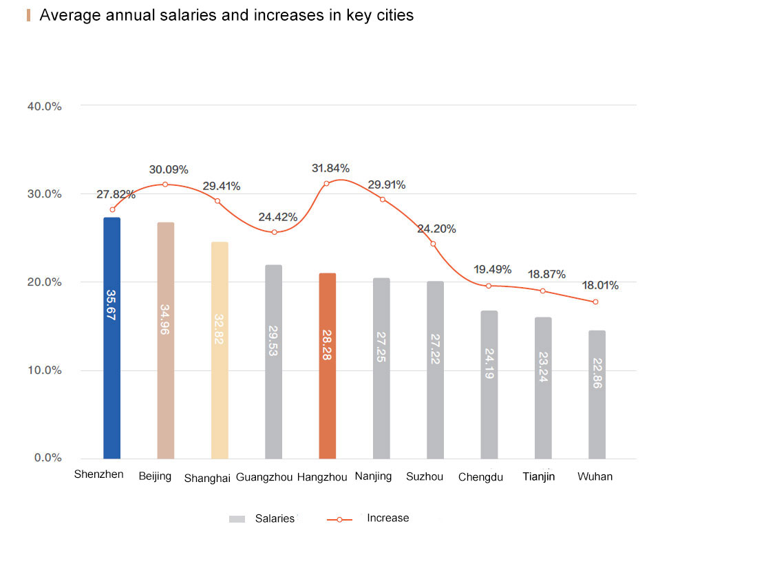 Chinese enterprises have narrowed the gap of salaries with those of companies in developed countries to attract top-end talents. For instance, the average annual salaries have reached 356,700 yuan ($53,968.71) in Shenzhen, 349,600 yuan in Beijing, 328,200 yuan in Shanghai and 295,300 yuan in Guangzhou.