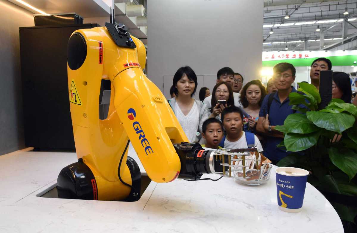 Visitors watch a Gree robot making coffee during a high-tech exhibition in Beijing. [Photo/Xinhua]