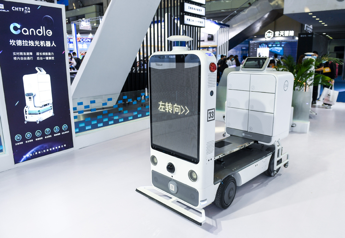 A delivery robot is seen at the 22nd China Hi-Tech Fair held in Shenzhen, South China's Guangdong province, Nov 11, 2020. [Photo/Xinhua]