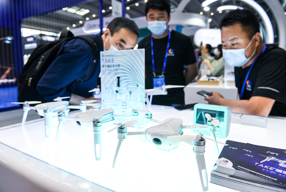 Visitors take a look at drones at the 22nd China Hi-Tech Fair held in Shenzhen, South China's Guangdong province, Nov 11, 2020. [Photo/Xinhua]