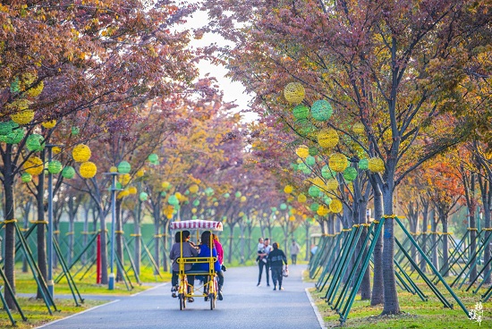 As fall approaches, an ecological and cultural park in the Sanwan area of Yangzhou has turned into a colorful fairy world, where dazzling yellow and red leaves mix with the green of the trees. [Photo/yznews.com.cn]