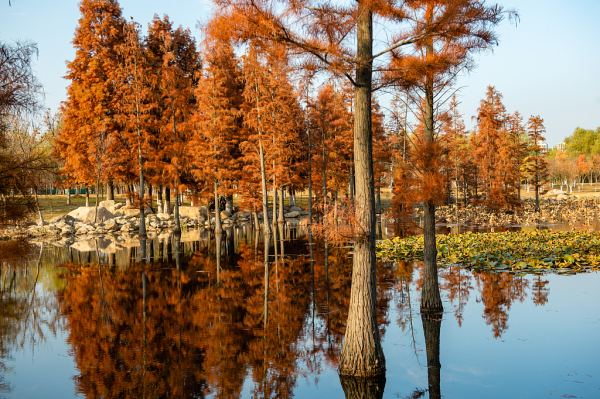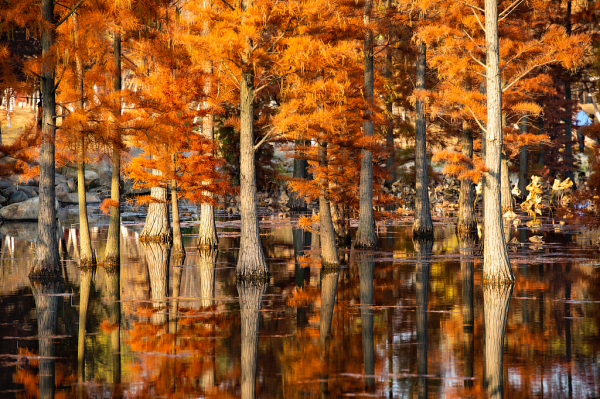 In late autumn, redwoods stand tall against the banks of the river, their reflections resembling a brightly-colored oil painting.