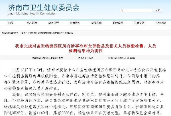 East China's city of Jinan has completed nucleic acid tests for 7,517 people, all testing negative for COVID-19, after imported frozen food and packaging in the cold storage of a logistics park in the city tested positive for the virus, according to the municipal health commission on Sunday.