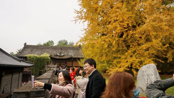 In late October, visitors take selfies with the ancient ginkgo tree in Xi'an, capital of Northwest China's Shaanxi province. The tree is more than 1,400 years old. [Photo by Wang Zhengheng/For chinadaily.com.cn]