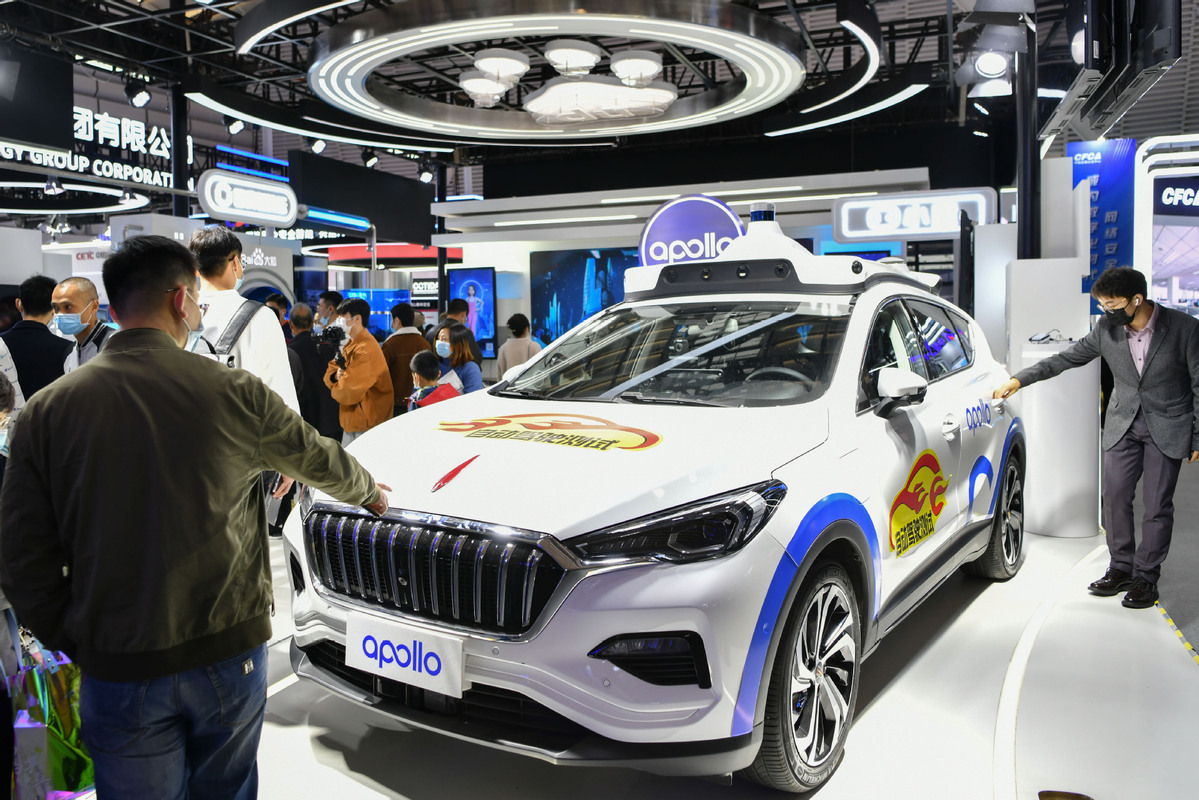 Visitors view a self-driving car during the Light of Internet Expo of the 2020 World Internet Conference in Wuzhen, East China's Zhejiang province, Nov 22, 2020. [Photo/Xinhua]