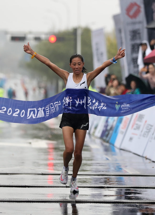 Li Shuyun clocks 2:51:26 and wins the first place for women in the full marathon category. [Photo by Zhang Wei/chinadaily.com.cn]