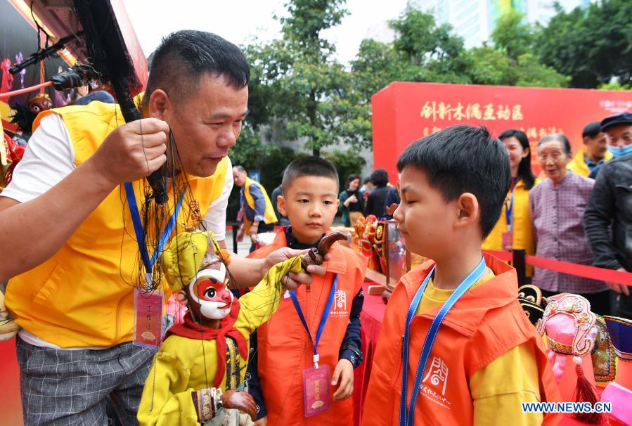 Wu Jinhong (1st L), an inheritor of Quanzhou puppet show, introduces ways to manipulate the marionette to students in Fuzhou, East China's Fujian province, Nov 21, 2020. [Photo/Xinhua]