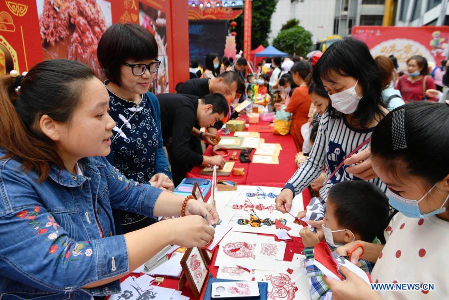 Students try the Pucheng paper-cutting in Fuzhou, East China's Fujian province, Nov 21, 2020. [Photo/Xinhua]