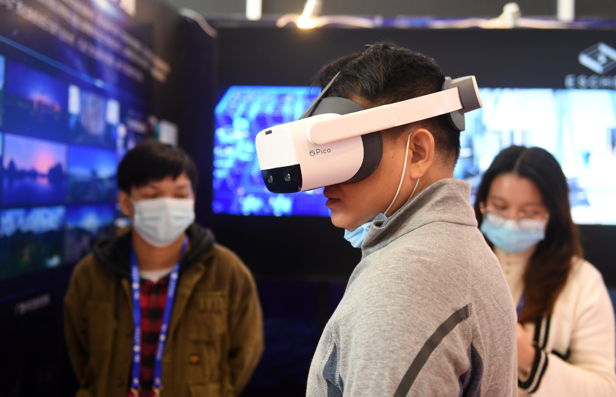 A visitor tries VR glasses during the 17th China-ASEAN Expo at Nanning International Convention and Exhibition Center in Nanning, South China's Guangxi Zhuang autonomous region, Nov 28, 2020. The expo runs from Nov 27 to 30 in Nanning. [Photo/Xinhua]