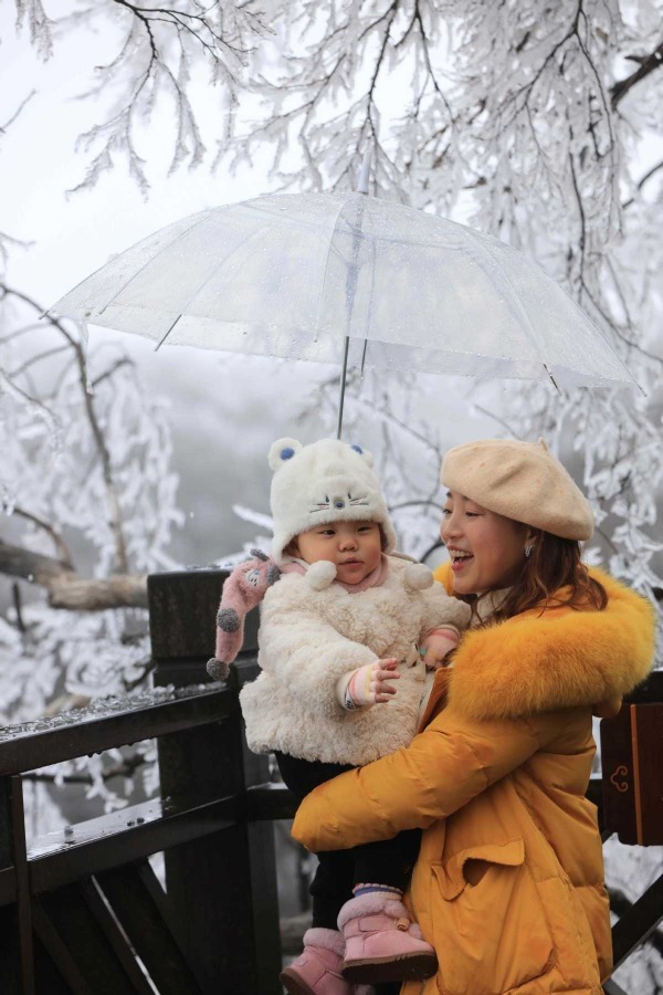 Tianmen Mountain and Tianzi Mountain in Zhangjiajie National Forest Park in Hunan province welcomed their first snow of the season on Thursday. Tree branches are frozen, and the mountains are shrouded in fog. The scenery attracts many visitors.