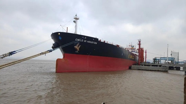 Cielo Di Houston, a tanker loaded with more than 37,000 metric tons of oil, departed from Zhoushan Port for Singapore on Dec 6, marking the official start of refined oil export by Zhejiang Petroleum & Chemical Co, local media reported.