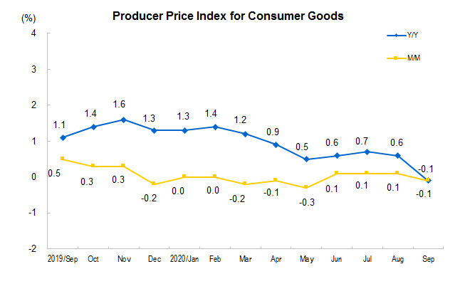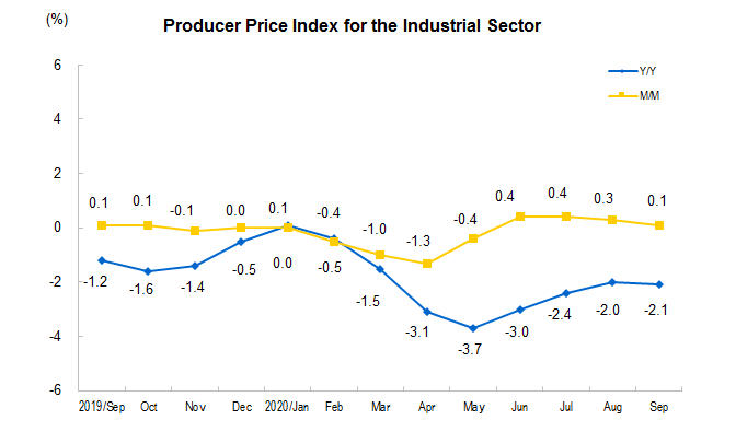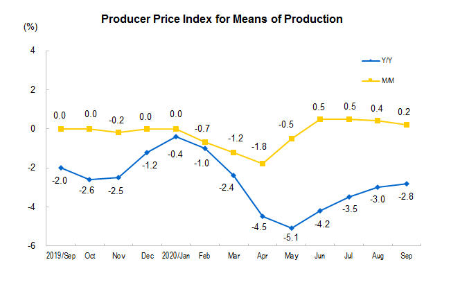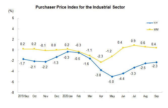 In September 2020, Producer Price Index (PPI) for manufactured goods dropped by 2.1 percent year-on-year and rose by 0.1 percent month-on-month. The purchasing price index for manufactured goods decreased by 2.3 percent year-on-year and increased by 0.4 percent month-on-month. From January to September, the producer price index for manufactured goods decreased by 2.0 percent year-on-year, and the purchasing price index for manufactured goods decreased by 2.6 percent.